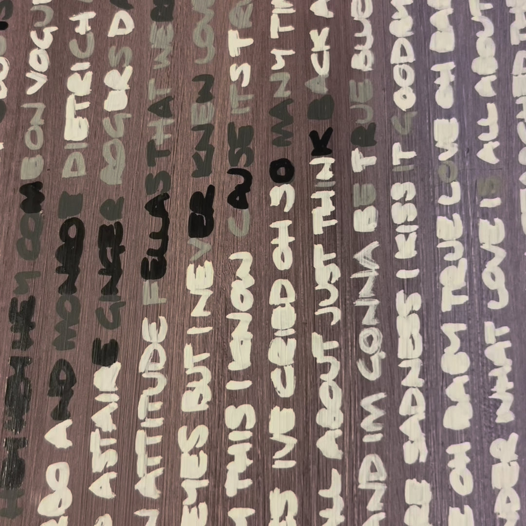 Portrait of Madonna. Text inspired by her songs is hand-written in varying shades over a light colour wash; the image emerging as one moves back from the painting. Created in her own words.